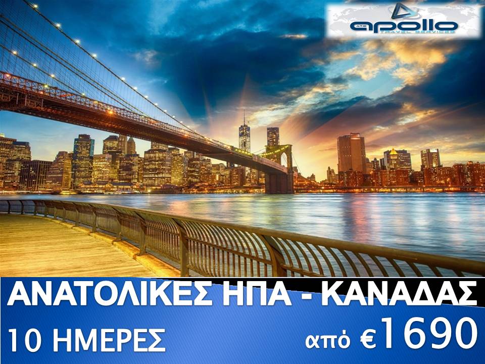 ΑΝΑΤΟΛΙΚΕΣ ΗΠΑ ΚΑΝΑΔΑΣ ΑΝΑΛΥΤΙΚΟ ΠΡΟΓΡΑΜΜΑ Ημέρα 1η: Αθήνα/Θεσσαλονίκη - Νέα Υόρκη Αναχώρηση για την Νέα Υόρκη, που θεωρείται η οικονομική μητρόπολη του κόσμου. Άφιξη και μεταφορά στο ξενοδοχείο. Χρόνος για τακτοποίηση. Λίγο αργότερα θα ξεκινήσουμε έναν περίπατο με τον συνοδό μας για μια πρώτη γνωριμία με την πιο συναρπαστική πόλη του πλανήτη. Ημέρα 2η: Νέα Υόρκη Σήμερα πραγματοποιείται η πρώτη από τις δύο ξεναγήσεις στα αξιοθέατα για τα οποία φημίζεται η πόλη. Θα δούμε το άγαλμα του σημαντικότερου εξερευνητή, του Χριστόφορου Κολόμβου με τις καραβέλες του, το οποίο σήμερα αποτελεί σημείο μέτρησης όλων των αποστάσεων από τη Νέα Υόρκη. Θα περάσουμε από το Λίνκολν Σέντερ που φιλοξενεί τη Φιλαρμονική και τη Μετροπόλιταν Όπερα, ιδανικός χώρος για τους λάτρεις της κλασσικής μουσικής. Το Σέντραλ Παρκ, ένα από τα πιο δημοφιλή πάρκα του κόσμου, το μέρος όπου χαλαρώνουν οι Νεοϋορκέζοι και περνούν τον ελεύθερο τους χρόνο. Συνεχίζουμε με το μνημείο του στρατηγού Γκραντ και το Πανεπιστήμιο Columbia, το σημαντικότερο πανεπιστήμιο θεωρητικών επιστημών της Νέας Υόρκης, στην είσοδο του οποίου γίνεται μνεία σε αρχαίους Έλληνες φιλοσόφους. Ακολουθεί η γειτονιά του Χάρλεμ, γνωστή στο παρελθόν ως η Μέκκα των αφροαμερικανών της Νέας Υόρκης όπου βρίσκεται το Apollo theater, στη σκηνή του οποίου έχουν ανέβει όλοι οι ημίθεοι της τζαζ αλλά και ο Michel Jackson. Η ξενάγηση ολοκληρώνεται με την 5η λεωφόρο με τα διάσημα καταστήματα οίκων μόδας και το Ροκφέλερ Σέντερ, ένα από τα μεγαλύτερα ιδιωτικά συγκροτήματα του κόσμου που ανήκει στην ομώνυμη οικογένεια, ορόσημο της πόλης, το οποίο φιλοξενεί το παρατηρητήριο «Top of the Rock». Θα καταλήξουμε στην Τάιμς Σκουέρ την πιο πολυσύχναστη και φωτογραφημένη πλατεία του Μανχάταν, όπου εκατομμύρια επισκέπτες θαυμάζουν κάθε χρόνο τους φωταγωγημένους ουρανοξύστες με τις πολύχρωμες πινακίδες «neon» που κάνουν πραγματικά τη νύχτα μέρα. Εκεί κοντά βρίσκεται το Μπρόντγουεϊ, κέντρο βιομηχανίας της ψυχαγωγίας όπου μπορεί κανείς να θαυμάσει τις πιο φαντασμαγορικές παραστάσεις στον κόσμο. Επιστροφή στο ξενοδοχείο μας. Για το βράδυ, προτείνουμε να παρακολουθήσετε μία από τις φημισμένες παραστάσεις Μιούζικαλ στα θέατρα του Μπρόντγουεϊ, ολοκληρώνοντας έτσι με τον καλύτερο τρόπο τη μέρα σας στη Νέα Υόρκη. Ημέρα 3η: Νέα Υόρκη Συγκέντρωση στο λόμπυ του ξενοδοχείου για το δεύτερο μέρος της ξενάγησης της πόλης στην οποία θα κατευθυνθούμε παράλληλα με τον ποταμό East περνώντας από τις προβλήτες του ανατολικού Μανχάταν και με θέα την κρεμαστή γέφυρα του Μπρούκλιν. Θα σταματήσουμε στο Μέγαρο των Ηνωμένων Εθνών, την έδρα του οργανισμού ο οποίος έχει ως σκοπό τη διαφύλαξη της παγκόσμιας ειρήνης, επίσης μελετά τις διεθνείς οικονομικές τάσεις, υποβάλλει μελέτες που αφορούν τα ανθρώπινα δικαιώματα, φυσικούς πόρους κ.λπ. Κατόπιν θα κάνουμε στάση στο Σταθμό Γκραντ Σέντραλ ο οποίος αποτελεί πύλη και σύμβολο της πόλης, όπου τουλάχιστον 750.000 άνθρωποι διέρχονται καθημερινά από την μεγαλοπρεπή κεντρική αίθουσα. Συνεχίζουμε με το Γκρίνουιτς Βίλατζ το οποίο αγαπήθηκε από καλλιτέχνες και συγγραφείς, σημείο αναφοράς η Washington square και το Πανεπιστήμιο της Νέας Υόρκης (N.Y.U). Ακολουθούν το Ηστ Βίλατζ, το Σόχο που είναι γεμάτο με διάσημους οίκους μόδας, η Μικρή Ιταλία και η Τσάινα Τάουν, δύο από τις πιο ζωντανές συνοικίες της πόλης όπου γίνεται αισθητή η πολυπολιτισμική ταυτότη