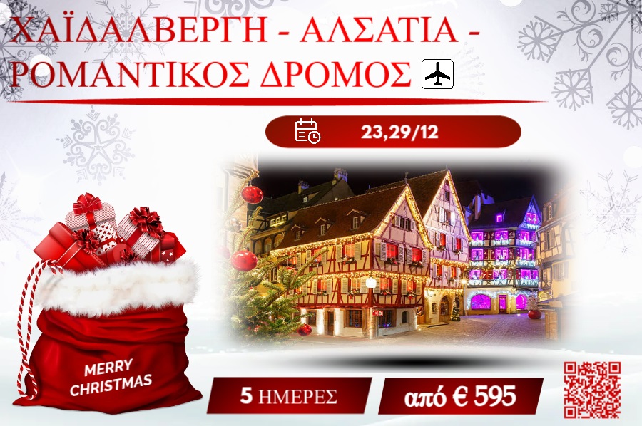 Χριστούγεννα '25 - Πρωτοχρονιά '26 | 5 Ημέρες από Θεσ/νίκη Εκεί που η Ευρώπη συναντά τη μαγεία των παραμυθιών Ακολουθήστε μας σε ένα αξέχαστο ταξίδι στην καρδιά της Κεντρικής Ευρώπης, εκεί όπου η ιστορία, η αρχιτεκτονική και η φύση συνυπάρχουν αρμονικά. Από τον μοντέρνο παλμό της Φρανκφούρτης και τη ρομαντική αύρα της Χαϊδελβέργης, μέχρι τα αλσατικά στολίδια του Στρασβούργου και του Κολμάρ και τις μεσαιωνικές καστροπολιτείες της Ρομαντικής Οδού, θα ζήσουμε εμπειρίες γεμάτες χρώμα, πολιτισμό και παράδοση. Ένα ταξίδι με εικόνες βγαλμένες από παραμύθι, που υπόσχεται αυθεντικές συγκινήσεις σε κάθε του στάση. Ελάτε μαζί μας σε αυτό το ταξίδι γιατί σας προσφέρουμε... Πλούσιο πρωινό και στη συνέχεια θα αφιερώσουμε όλη την ημέρα μας στη παραμυθένια Χαϊδελβέργη. Είναι η έδρα του παλαιότερου πανεπιστημίου της Γερμανίας, χτισμένη στις όχθες του ποταμού Νέκαρ και στη σκιά του κάστρου το οποίο δεσπόζει στον λόφο. Θα περπατήσουμε στο πεζοδρομημένο ιστορικό της κέντρο που θεωρείται ο μεγαλύτερος πεζόδρομος της Γερμανίας με μήκος 1,6 χλμ. Θα θαυμάσουμε μεσαιωνικές και νεότερης περιόδου εκκλησίες, όπως αυτή του Αγίου Πνεύματος και αυτή των Ιησουιτών. Στην πόλη επίσης εντυπωσιάζουν η λεγόμενη «φυλακή των φοιτητών», ο «πύργος των μαγισσών», τμήμα του μεσαιωνικού οχυρωματικού τείχους, το ξενοδοχείο Zum Ritter, το οποίο χρονολογείται από το 1592, το παλιό πανεπιστήμιο της πόλης και την γέφυρα που ενώνει την πόλη με την απέναντι όχθη. Ελεύθερος χρόνος για το γεύμα σας σε κάποιο από τα παραδοσιακά εστιατόρια της παλιάς πόλης που φημίζονται για τα τοπικά εδέσματα ή σε κάποιες από τις μπυραρίες που σφύζουν από ζωή. Επίσης μπορείτε να απολαύσετε mini κρουαζιέρα στο ποταμό Νέκαρ για να θαυμάσετε τη πόλη μέσα από μια άλλη οπτική γωνία . Αργά το απόγευμα επιστροφή στο ξενοδοχείο μας. Πρωινό και αναχωρούμε για το Στρασβούργο. Αμέσως με την άφιξή μας, θα ξεκινήσουμε την ξενάγηση μας, στην πόλη που μοιάζει περισσότερο με πρωτεύουσα της Ευρώπης παρά με παλιά πόλη της Αλσατίας. Το ιστορικό κέντρο, ονομαζόμενο "Petite France" (Μικρή Γαλλία), χαρακτηρίστηκε ως "αξιοθέατο παγκόσμιας κληρονομιάς" από την UNESCO το 1988. Διαθέτει τη ζωντάνια μιας πανεπιστημιούπολης, εξαιτίας του πανεπιστημίου του Στρασβούργου που ιδρύθηκε το 1566 ένα από τα παλαιότερα της χώρας. Θα περπατήσουμε στην παλιά πόλη, γεμάτη γραφικά σπιτάκια με ξύλο και χρώμα, όπου δεσπόζει ο καθεδρικός ναός της Παναγίας του Στρασβούργου. Αξίζει να θαυμάσετε το αστρονομικό ρολόι και τα βιτρό του 12ου αιώνα. Στην πλατεία Σατό δίπλα στον καθεδρικό, βρίσκεται ο πύργος των Ροάν του 18ου αιώνα, άλλοτε οικία του αρχιεπισκόπου, που σήμερα στεγάζει τα κυριότερα μουσεία της πόλης, το μουσείο Καλών Τεχνών, το Μουσείο Διακοσμητικών Τεχνών και Αρχαιολογίας και την οικία Καμερζέλ. Ελεύθερος χρόνος στους πεζόδρομους της πόλης για καφέ ή φαγητό στα εξαιρετικά αλσατικά εστιατόρια. Στη συνέχεια αναχωρούμε για τη Γαλλική πόλη Κολμάρ, το στολίδι της Αλσατίας. Περιηγηθείτε στο ιστορικό του κέντρο που χαρακτηρίζεται από παραδοσιακά σπίτια χτισμένα στις όχθες του ποταμού Λάουχ. Εκεί θα θαυμάσετε το δημαρχείο, τον καθεδρικό ναό αφιερωμένο στον Άγιο Μαρτίνο όπως επίσης και μικρές πανέμορφες πλατείες με ενδιαφέρουσες υπαίθριες αγορές. Θα έχουμε ελεύθερο χρόνο στο πιο όμορφο σημείο της παλαιάς πόλης, την Μικρή Βενετία που χαρακτηρίζεται από κανάλια, περί