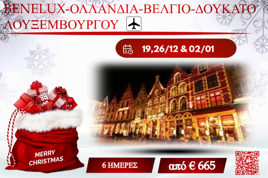 Χριστούγεννα '25 - Πρωτοχρονιά '26 | 6 ημερες Σας προσκαλούμε να ζήσετε ένα ανεπανάληπτο ταξίδι γεμάτο χριστουγεννιάτικη μαγεία και ευρωπαϊκή φινέτσα, μέσα από ένα εξαήμερο πρόγραμμα που θα σας ταξιδέψει στις καρδιές τριών συναρπαστικών χωρών: της Ολλανδίας, του Βελγίου και του Λουξεμβούργου. Η διαδρομή μας ξεκινά από το Άμστερνταμ, μια πόλη που ξέρει να συνδυάζει την ελεύθερη και ζωντανή της ατμόσφαιρα με τη ρομαντική γοητεία των καναλιών της. Την περίοδο των Χριστουγέννων, τα φωταγωγημένα σπίτια, οι γιορτινές αγορές, τα παγοδρόμια και οι στολισμένες πλατείες δημιουργούν σκηνές βγαλμένες από παραμύθι. Στη συνέχεια, θα ανακαλύψουμε τις Βρυξέλλες – την καρδιά της Ευρώπης – όπου ο συνδυασμός φαντασμαγορικού φωτισμού, ζωντανών εκδηλώσεων και παραδοσιακών λιχουδιών χαρίζει στην πόλη μια αξεπέραστη χριστουγεννιάτικη λάμψη. Η εκδρομή μας κορυφώνεται με επισκέψεις στο Λουξεμβούργο, με την ιδιαίτερη γοητεία του, αλλά και στη μεσαιωνική Μπριζ, όπου τα γραφικά κανάλια και τα ιστορικά κτίρια μεταμορφώνονται σε σκηνικό γιορτής, δημιουργώντας μια ατμόσφαιρα μοναδική. Ένα ταξίδι γεμάτο εικόνες, αρώματα και γεύσεις των Χριστουγέννων, που υπόσχεται να σας μείνει αξέχαστο. Ξεκινώντας την ημέρα των Χριστουγέννων με ένα πλούσιο πρωινό και με τις αποσκευές μας αναχωρούμε από το Άμστερνταμ με προορισμό τις Βρυξέλλες. Στη διαδρομή θα κάνουμε στάση στην πανέμορφη Αμβέρσα, τη δεύτερη μεγαλύτερη πόλη του Βελγίου και σημαντικό εμπορικό κέντρο χάρη στο μεγάλο της λιμάνι στον ποταμό Scheldt. Η Αμβέρσα είναι παγκοσμίως γνωστή ως «πρωτεύουσα των διαμαντιών» αλλά και για την εντυπωσιακή αρχιτεκτονική της. Θα περπατήσουμε στο ιστορικό κέντρο με το Δημαρχείο και την κεντρική πλατεία, θα θαυμάσουμε τον μεγαλοπρεπή Καθεδρικό Ναό της Παναγίας, και θα δούμε το Boerentoren, έναν από τους πρώτους ουρανοξύστες της Ευρώπης. Τα στενά της πόλης κρύβουν δεκάδες εστιατόρια, μπαρ, σοκολατερί, καταστήματα διαμαντιών και μπουτίκ σχεδιαστών, που αποτυπώνουν τον κοσμοπολίτικο χαρακτήρα της. Στη συνέχεια συνεχίζουμε για τις Βρυξέλλες, την καρδιά της Ευρώπης. Με την άφιξή μας θα ξεκινήσουμε πανοραμική ξενάγηση της πόλης. Θα δούμε το Atomium, τα Βασιλικά Παλάτια του Λάκεν, τον Γιαπωνέζικο Πύργο και την Κινέζικη Παγόδα, την Πλατεία Grand Sablon με τον ομώνυμο ναό, το Δικαστικό Μέγαρο, το Μουσείο Καλών Τεχνών, τα Βασιλικά Ανάκτορα, την «Ευρωπαϊκή Γειτονιά» με το Ευρωπαϊκό Συμβούλιο και το Ευρωπαϊκό Κοινοβούλιο, την Αψίδα του Θριάμβου και τον Καθεδρικό Ναό των Βρυξελλών. Η ξενάγησή μας θα καταλήξει στη Grand Place, την κεντρική πλατεία της πόλης, στολίδι γοτθικής και μπαρόκ αρχιτεκτονικής. Νωρίς το απόγευμα θα τακτοποιηθούμε στο ξενοδοχείο μας. Το βράδυ προτείνουμε μια βόλτα στη Grand Place, όπου φιλοξενείται το εντυπωσιακό φεστιβάλ Winter Wonders. Εκεί θα απολαύσετε το εντυπωσιακό χριστουγεννιάτικο δέντρο, τη φάτνη σε φυσικό μέγεθος, το παγοδρόμιο, τα μαγικά φώτα και τις χριστουγεννιάτικες αγορές, που προσελκύουν κάθε χρόνο εκατομμύρια επισκέπτες από όλο τον κόσμο. Η ατμόσφαιρα θα σας μείνει αξέχαστη! Η σημερινή ημέρα είναι ελεύθερη για να την αξιοποιήσετε στις Βρυξέλλες όπως επιθυμείτε. Αν όμως θέλετε να ανακαλύψετε περισσότερες ομορφιές της περιοχής, μπορείτε να συμμετάσχετε στην προαιρετική μας εκδρομή στις γραφικές πόλεις της Γάνδης και της Μπριζ, που σίγουρα θα σας εντυπωσιάσουν. Ξεκινάμε από τη με