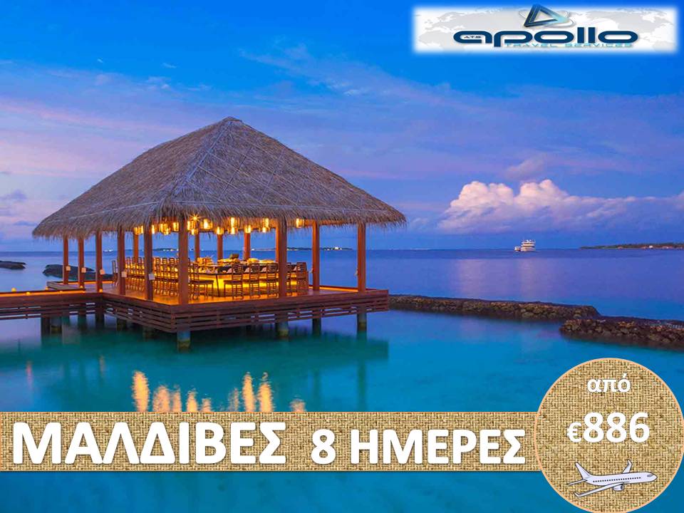 Οι Μαλδίβες με τα μικρά νησιά του Ινδικού ωκεανού αποτελούν τον απόλυτο εξωτικό προορισμό των ταξιδιωτών που επιζητούν γαλαζοπράσινα νερά, θαυμάσιες παραλίες και μοναδικές υποβρύχιες δραστηριότητες. Οι Μαλδίβες είναι ένα σύμπλεγμα από κατοικημένα και ακατοίκητα νησάκια με μεγαλύτερο το νησί του Μάλε, όπου βρίσκεται και το Διεθνές αεροδρόμιο. Μην ξεχάσετε να επισκεφθείτε την παραδοσιακή αγορά τοπικών προϊόντων και το Μεγάλο Τζαμί της Παρασκευής. Ο τροπικός αυτός παράδεισος προσφέρεται για διακοπές όλο το χρόνο με θερμοκρασίες που κυμαίνονται από 25-30 βαθμούς. Με τις νέες προσφορές επιλέξτε από μια μεγάλη ποικιλία ξενοδοχείων οικονομικά, με πολύ καλή ποιότητα όπως τα Holiday Island Resort, Sun Island Resort 4*s. ή το πιο ρομαντικό και νέο ξενοδοχείο 5* Kandima.